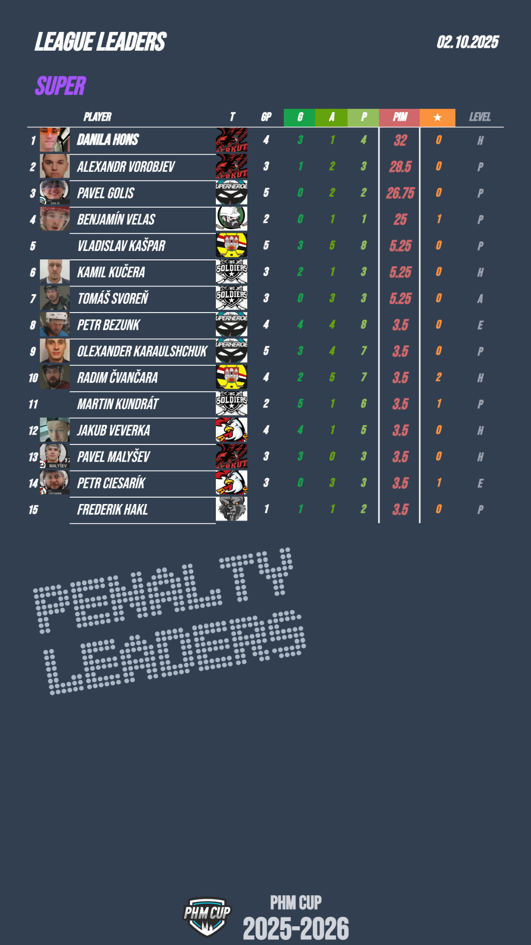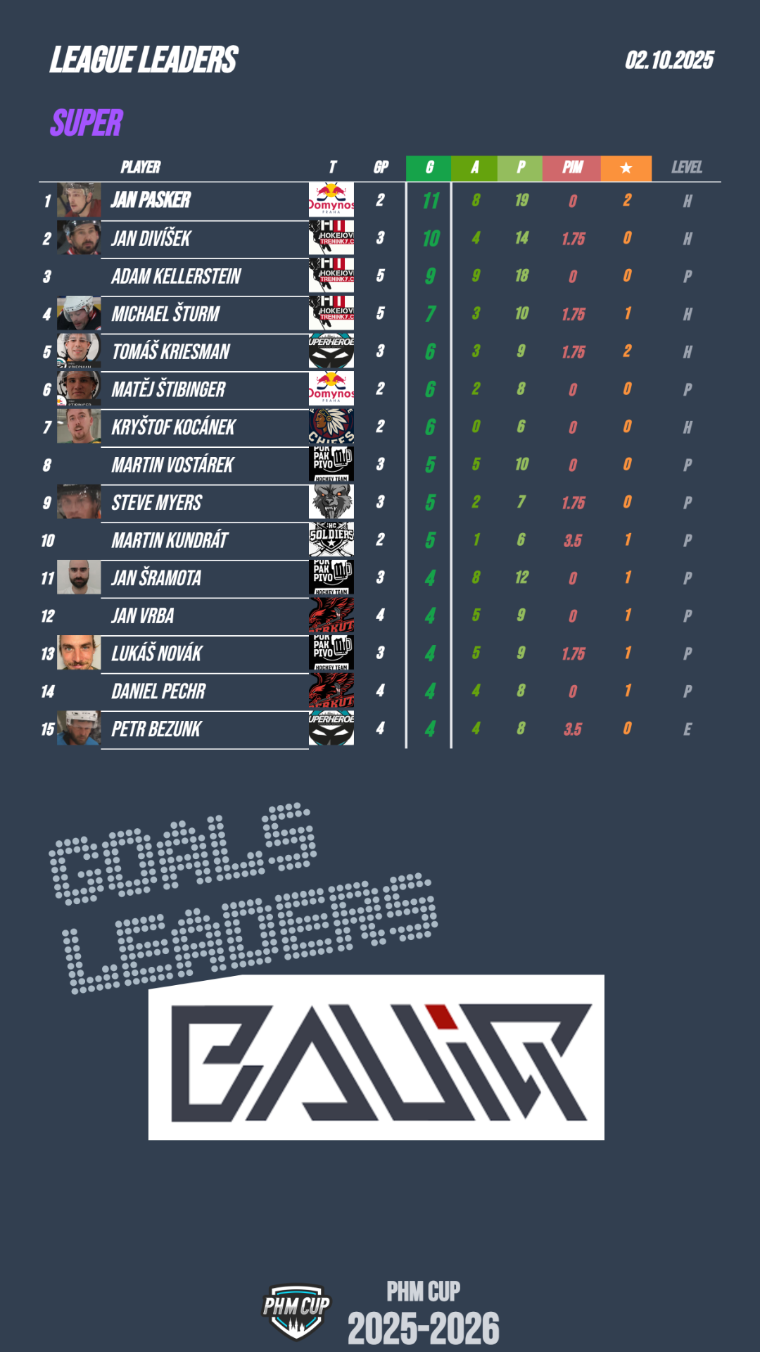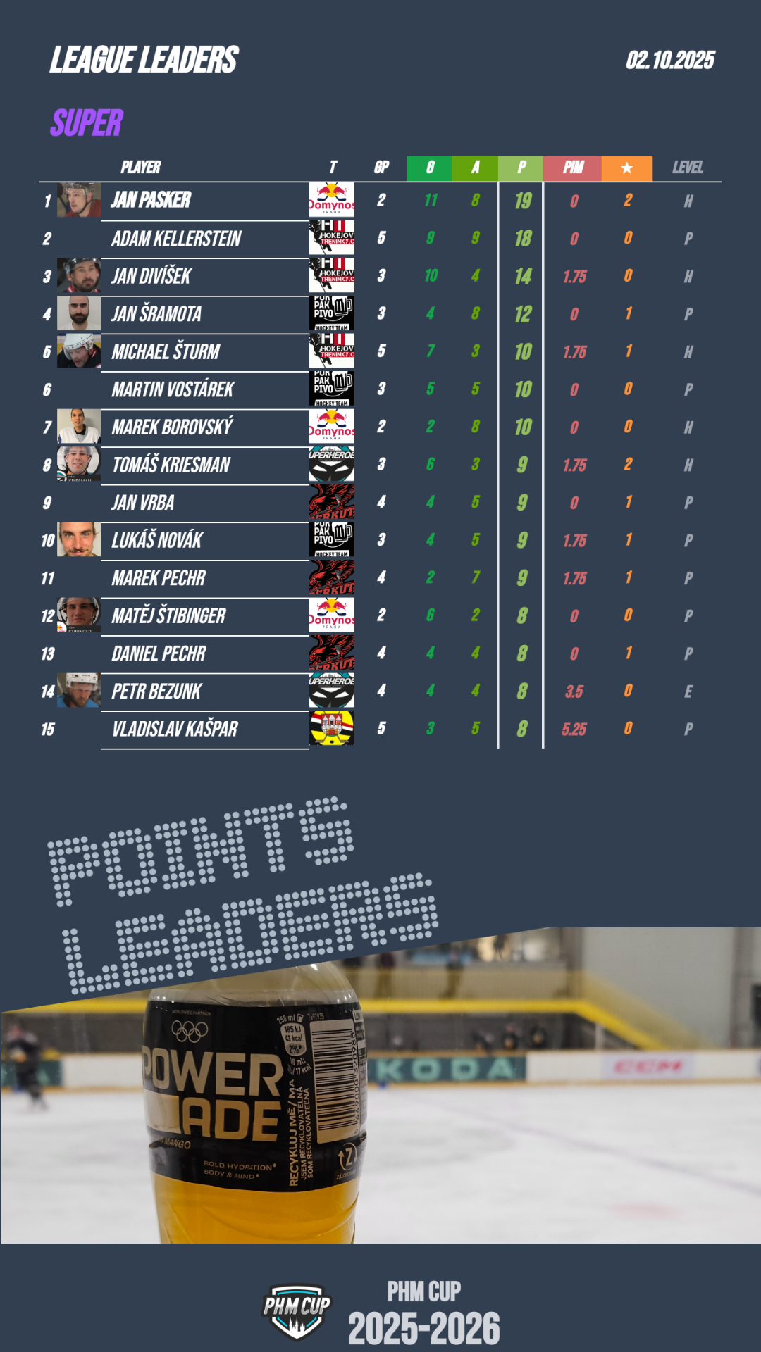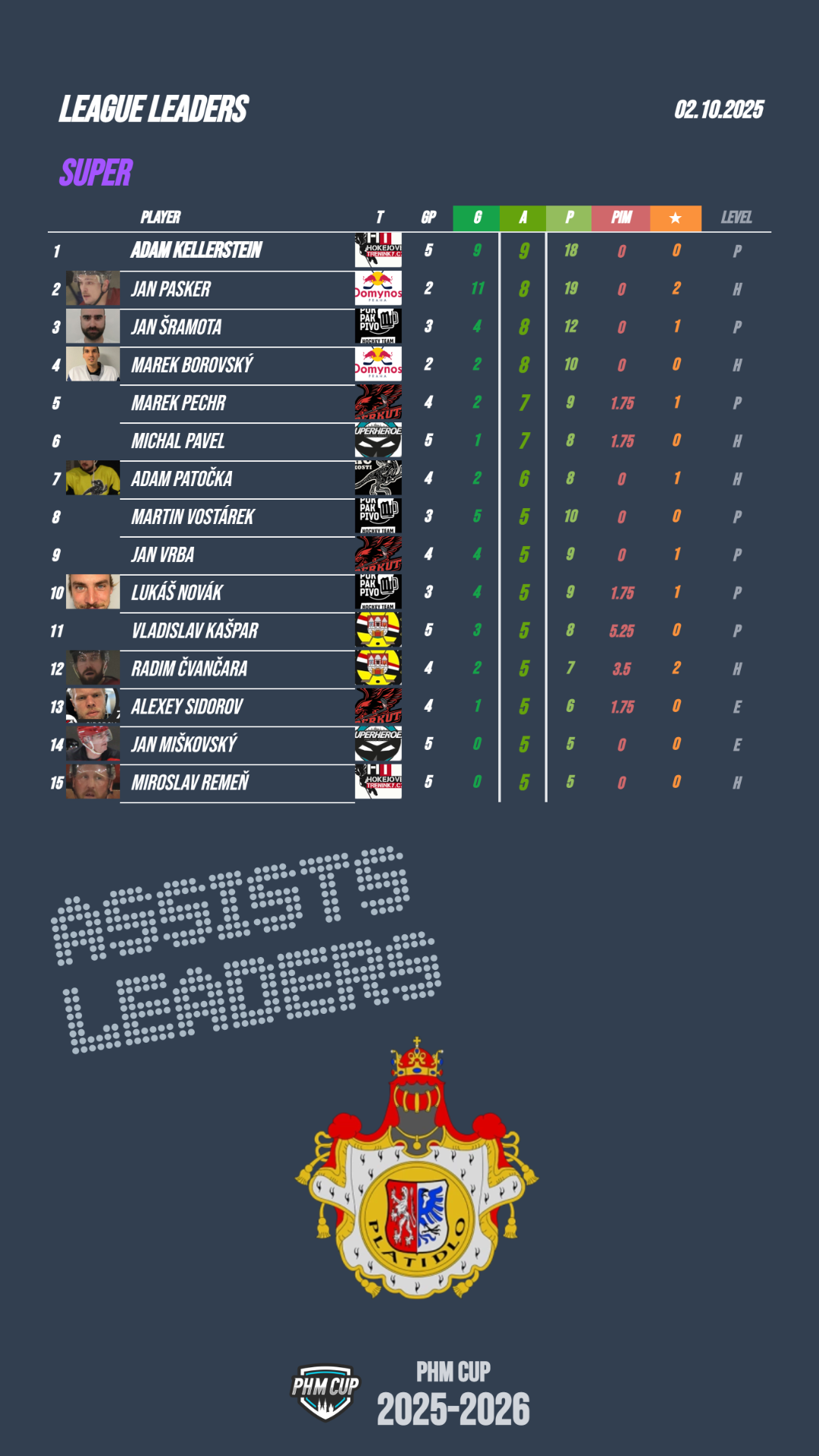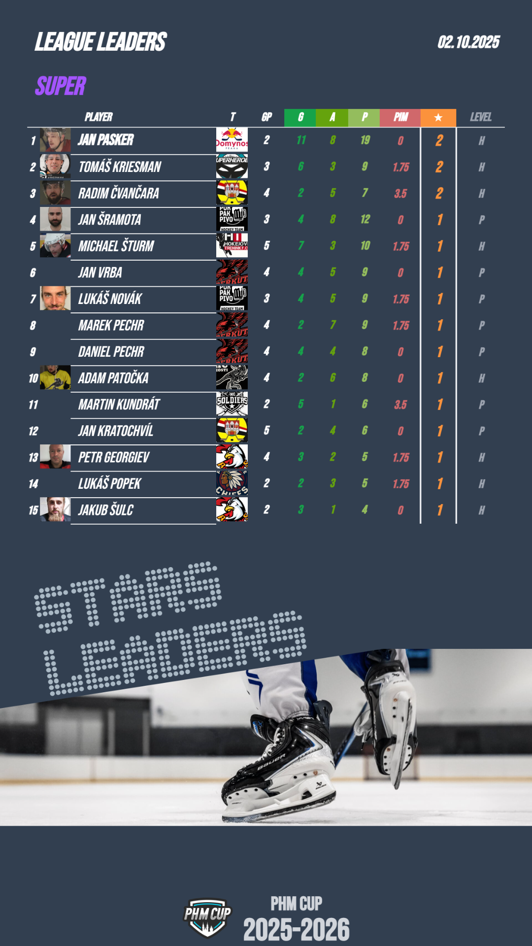 Statistikám kraluje Jan Pasker – 19 bodů a naprostá dominance v produktivitě. Těsně za ním Adam Kellerstein (18 bodů), který je jedním z nejkomplexnějších hráčů ligy. Výborný start má i Jan Divíšek a Jan Šramota, kteří dokazují, že menší počet zápasů neznamená menší přínos.